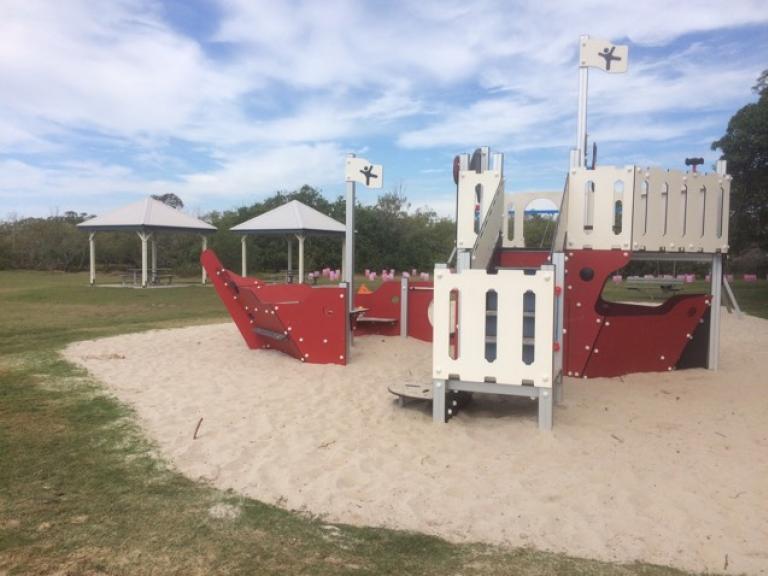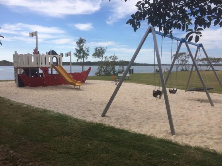Located across the foot bridge on Chambers Island. Great shade under trees.